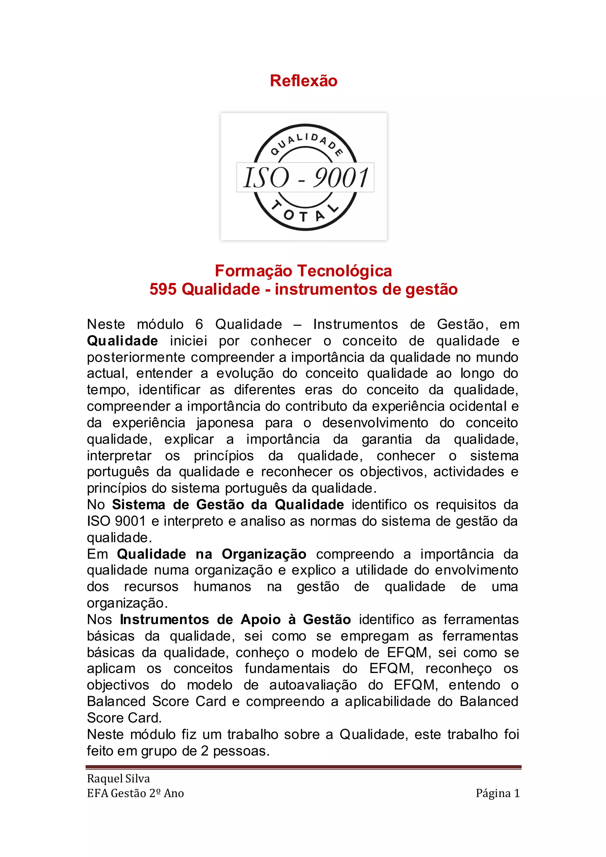 Este documento resume os principais pontos abordados no módulo "Qualidade – Instrumentos de Gestão". O autor aprendeu sobre o conceito de qualidade e sua evolução, os princípios da qualidade e o Sistema Português da Qualidade. Também estudou os requisitos da norma ISO 9001 e como implementar um sistema de gestão da qualidade. O documento descreve ainda as ferramentas da qualidade como o gráfico de fluxo e o diagrama de Pareto.