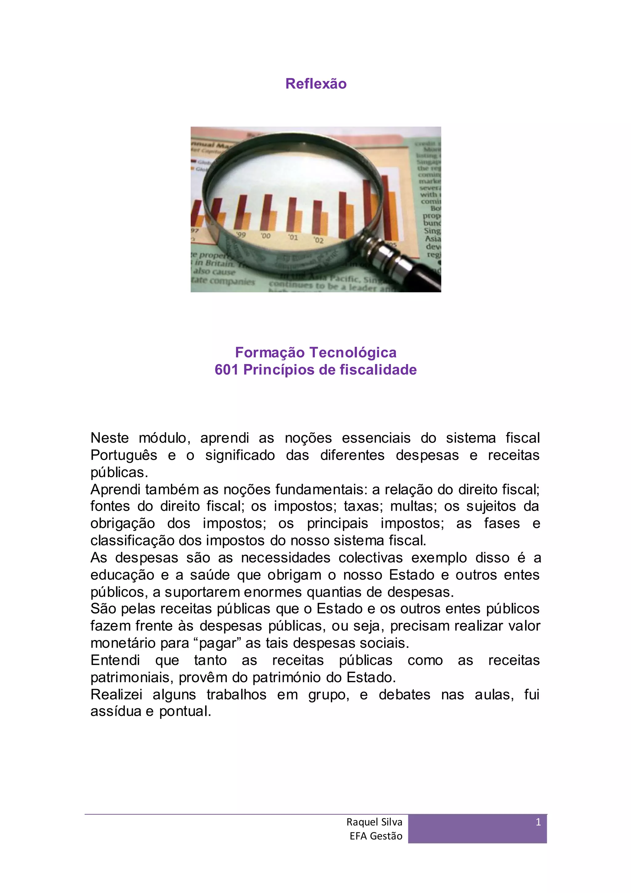 Este documento resume os principais pontos aprendidos no módulo 601 Princípios de Fiscalidade. A estudante aprendeu sobre o sistema fiscal português, os diferentes tipos de receitas e despesas públicas, e os conceitos fundamentais de direito fiscal como impostos e taxas. Ela também entendeu que as receitas públicas são usadas para pagar as despesas sociais do Estado.