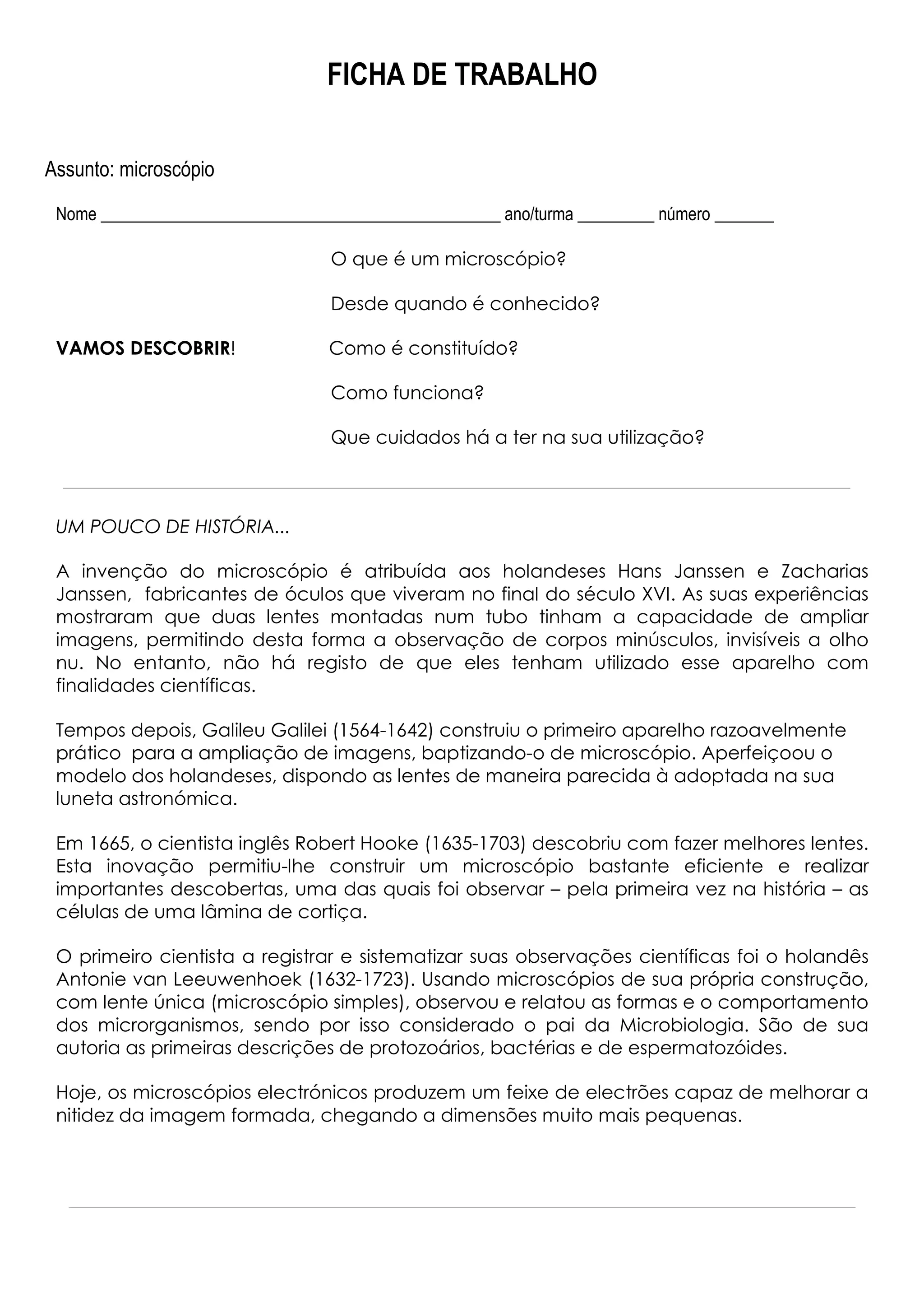 O documento fornece informações sobre a história e constituição do microscópio. Desde o final do século XVI, dois holandeses descobriram que lentes montadas em um tubo poderiam ampliar imagens. Galileu Galilei construiu o primeiro microscópio prático no século XVII. Hoje, microscópios eletrônicos podem ampliar imagens em escalas menores. Um microscópio óptico é constituído por várias partes, incluindo ocular, tubo, objetiva e platina.