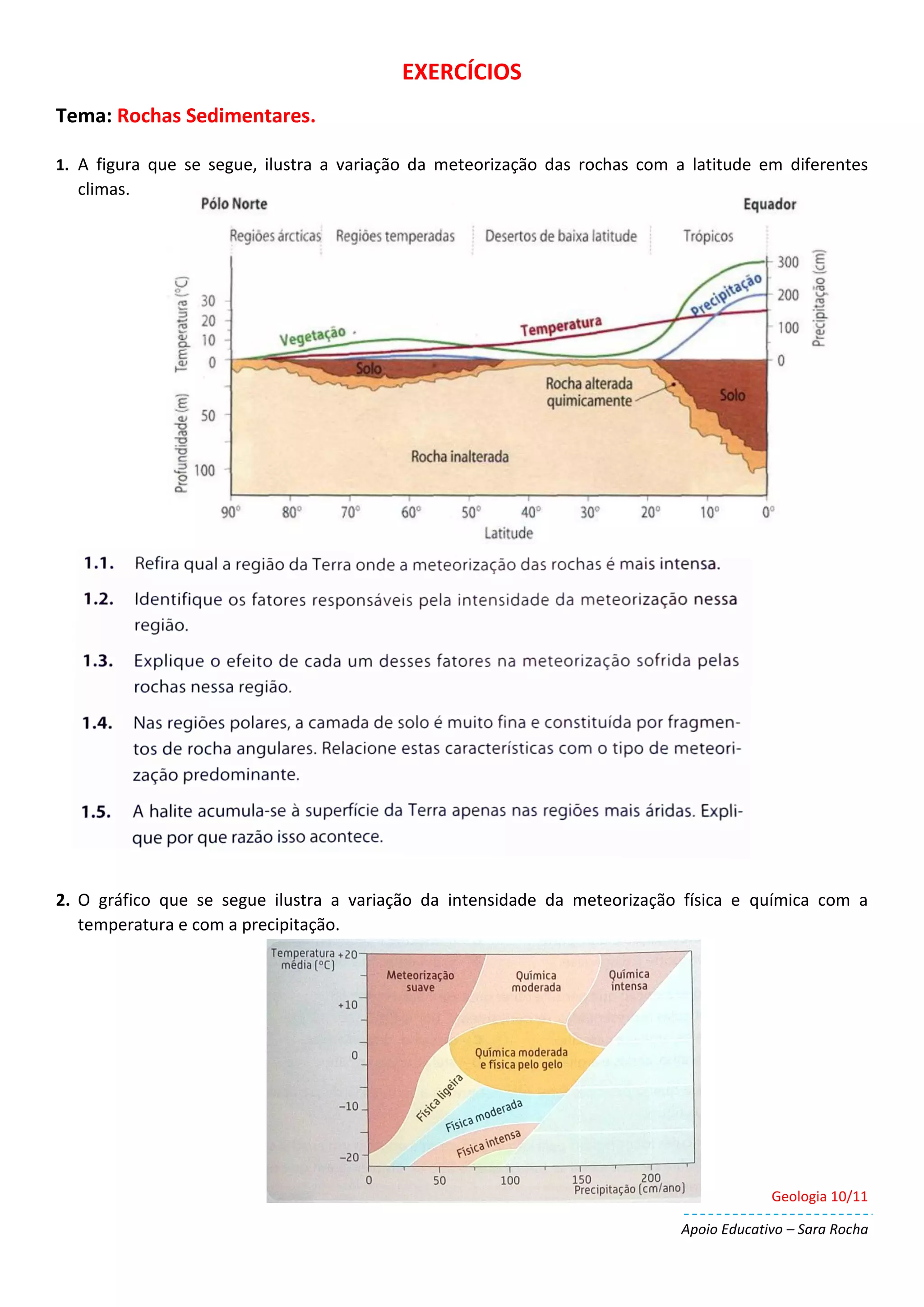 O documento discute rochas sedimentares e inclui: 1) uma figura sobre a variação da meteorização com a latitude e clima, 2) um gráfico sobre a variação da meteorização com temperatura e precipitação, 3) perguntas sobre as etapas de formação de rochas sedimentares, e 4) uma figura de grãos de areia observados sob lupa.