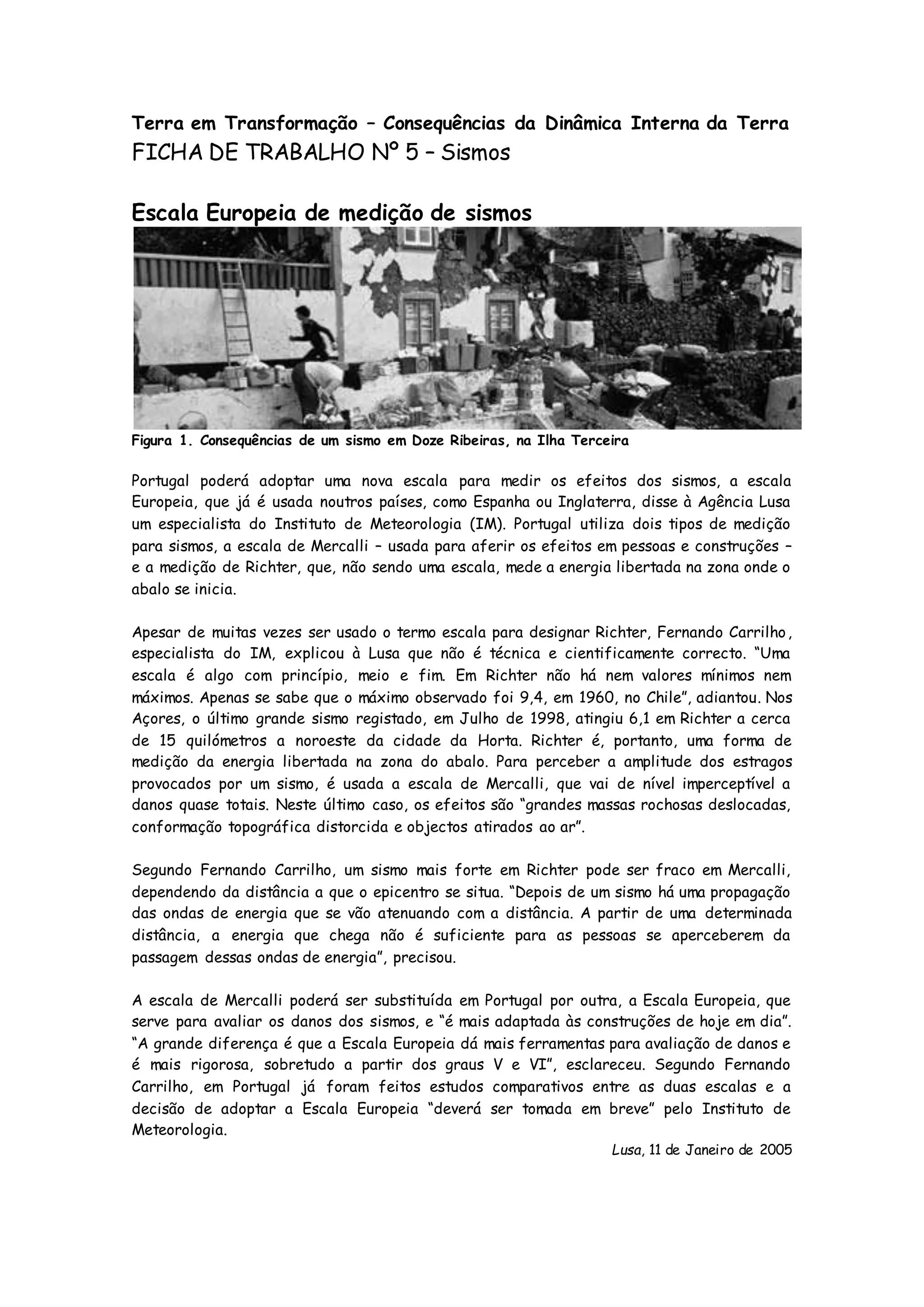 Portugal poderá adotar a Escala Europeia para medir sismos, que avalia danos de forma mais rigorosa e adaptada às construções atuais, substituindo a escala de Mercalli. Richter mede a energia libertada no epicentro e não é propriamente uma escala, enquanto Mercalli avalia os efeitos percebidos. Um sismo pode causar poucos danos se distante do epicentro, apesar da alta magnitude.
