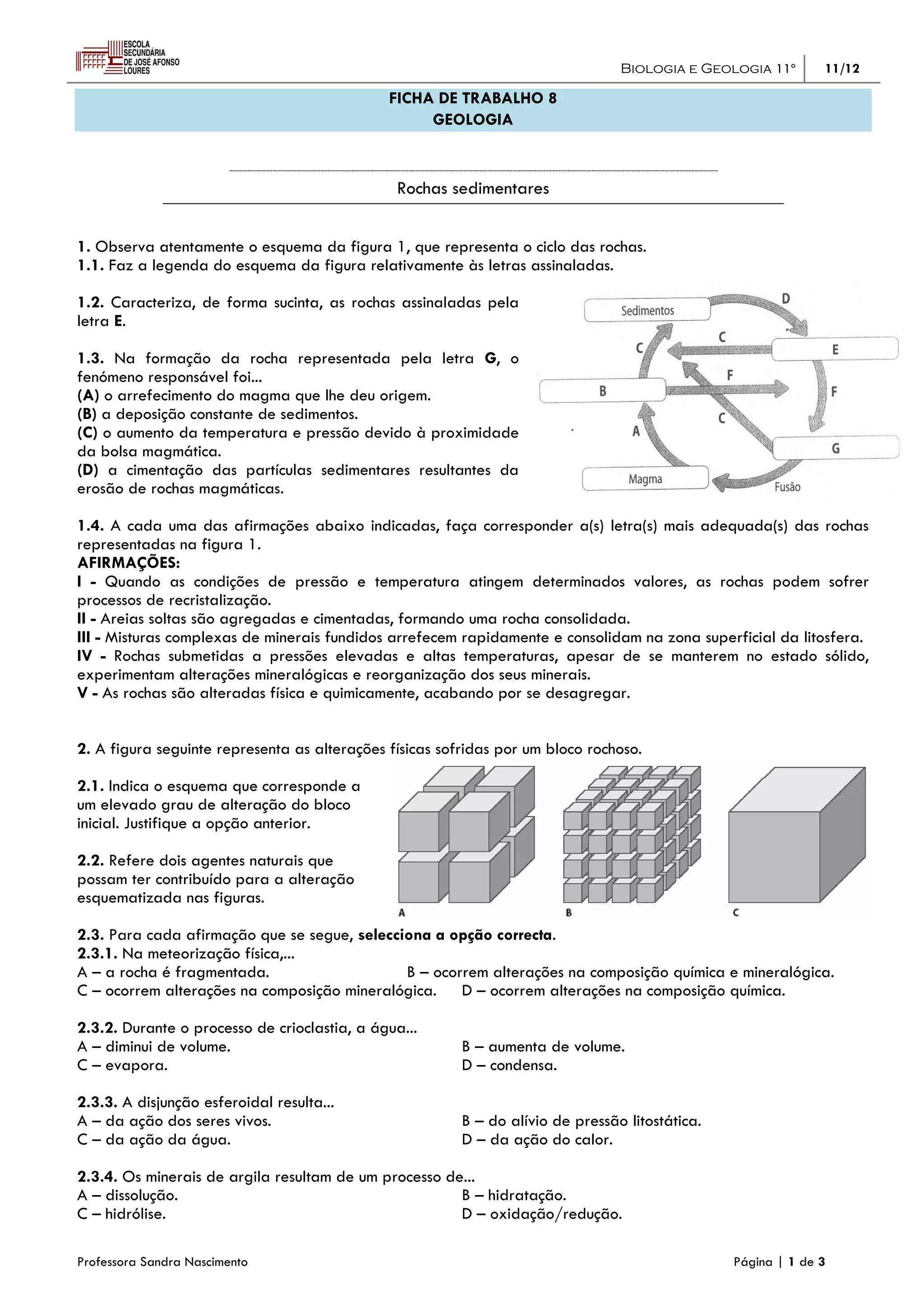 Este documento fornece informações sobre rochas sedimentares. Discute o ciclo das rochas, características de rochas sedimentares, processos de alteração de rochas e formação de estratos geológicos. Inclui questões sobre identificação de rochas, processos de formação, sequência estratigráfica e princípios geológicos.