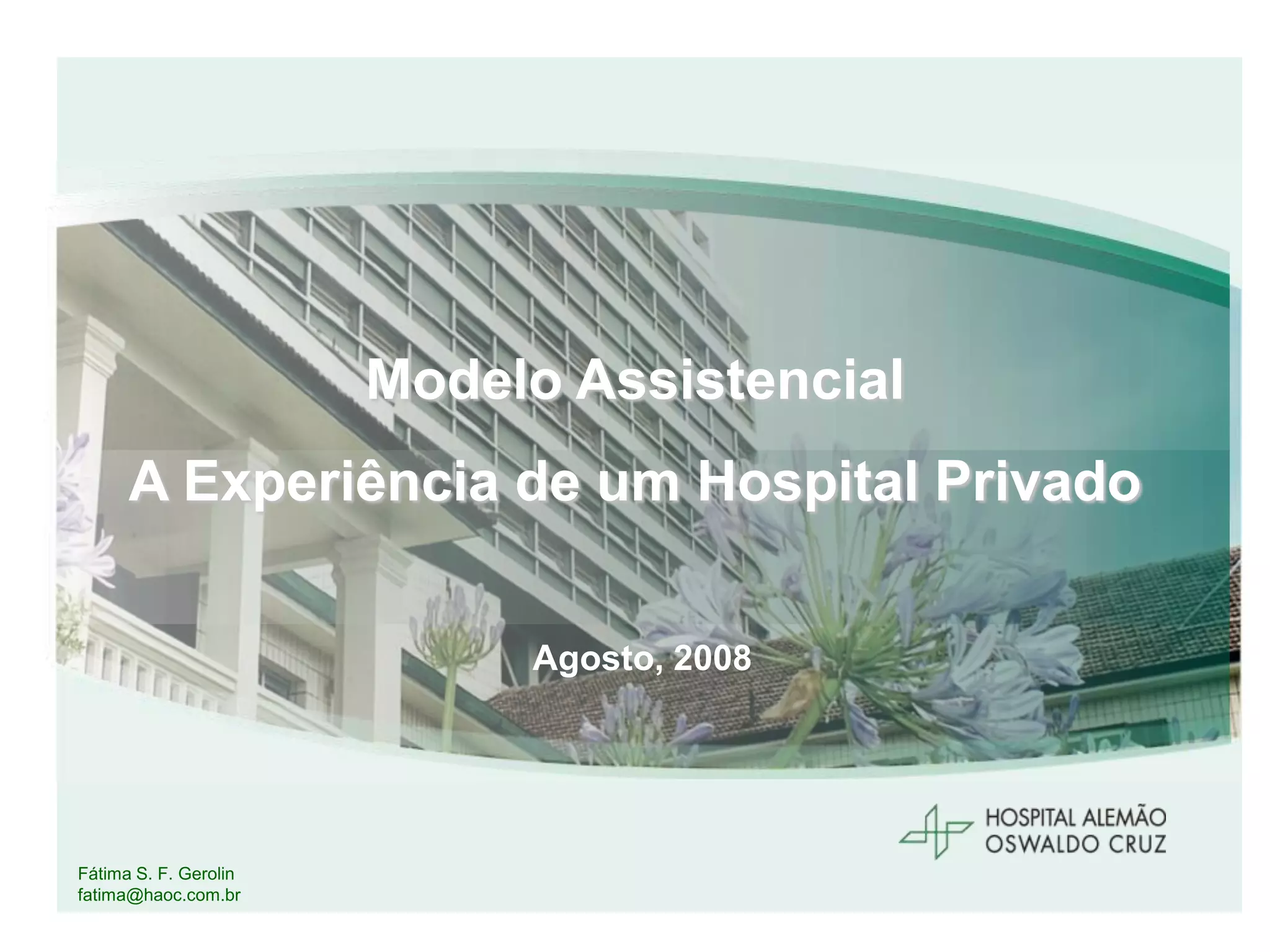 O documento descreve a história e o modelo assistencial do Hospital Alemão Oswaldo Cruz, desde sua fundação em 1897 por imigrantes alemães até os dias atuais. O modelo é baseado nas teorias de Dorothea Orem e Wanda Horta, focando no autocuidado do paciente e no equilíbrio entre suas necessidades. Ao longo do tempo, o hospital investiu no aprimoramento da enfermagem, com treinamentos, sistematização da assistência e valorização dos profissionais.