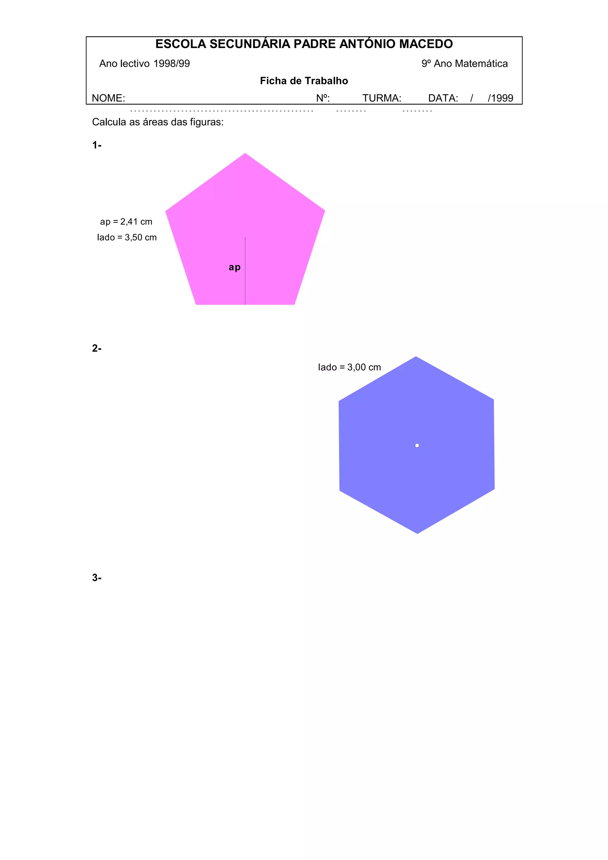 O documento fornece uma ficha de trabalho de matemática para calcular as áreas de três figuras geométricas: um quadrado, um triângulo equilátero e um círculo.