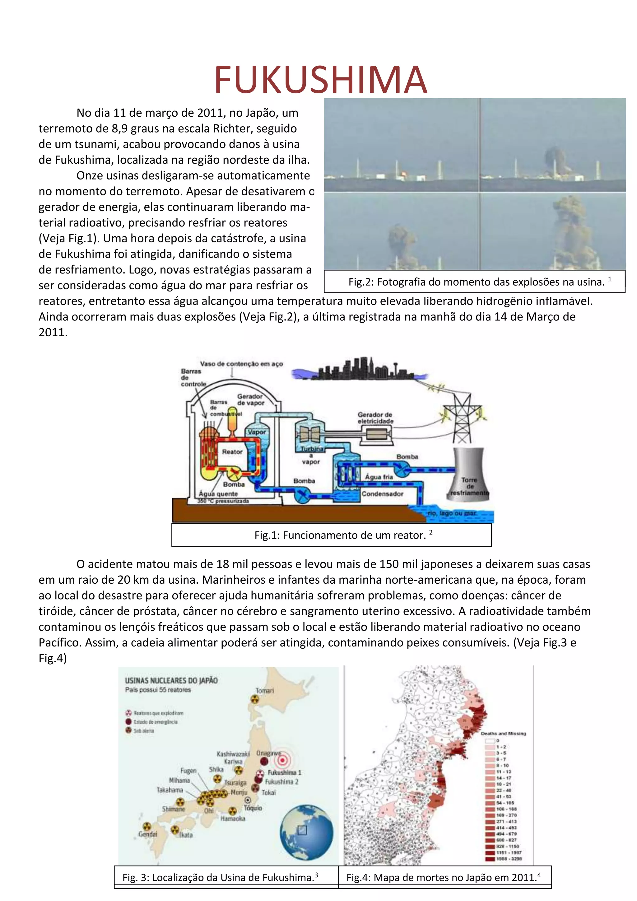 Um terremoto e tsunami em 2011 danificaram a usina nuclear de Fukushima no Japão, levando ao vazamento de material radioativo. Mais de 18 mil pessoas morreram e 150 mil tiveram que deixar suas casas. Anos depois, a radiação ainda é alta o suficiente para matar em poucas horas e continua contaminando o meio ambiente.