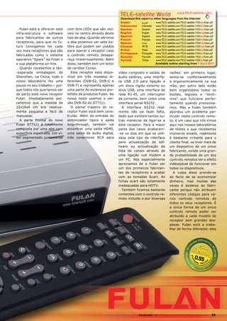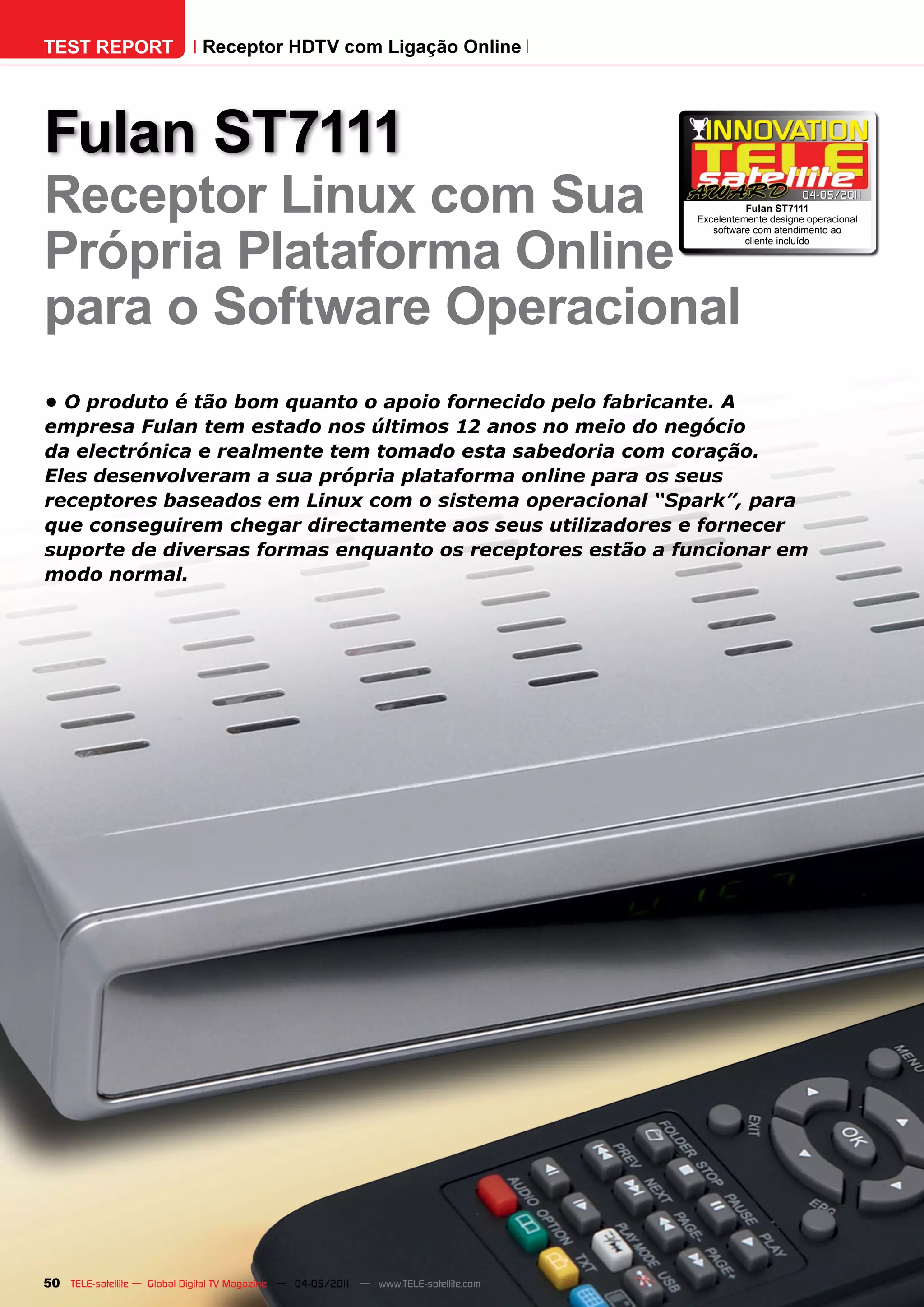 1. O documento descreve um teste realizado ao receptor HDTV Fulan ST7111 com sistema operacional próprio Spark e plataforma online de suporte.