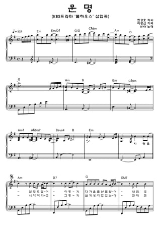 Esta partitura musical contém a melodia e acompanhamento para uma canção coreana em três frases ou menos. A música é escrita em várias chaves e utiliza acordes como Em, Am, D, G e progressões como Am - D7 - G - CM7. A partitura contém repetições da melodia principal e uma coda no final.