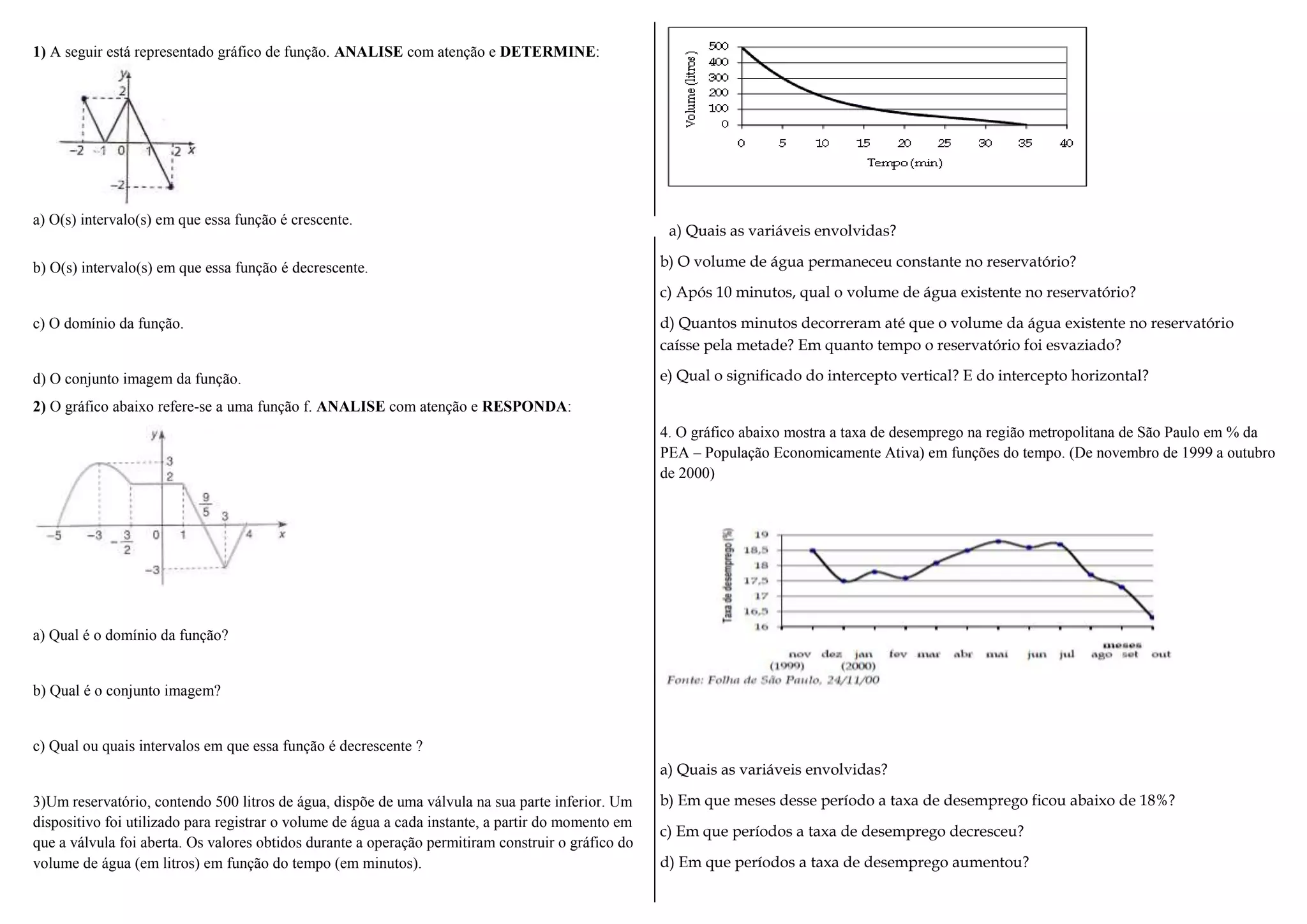 Este documento contém 4 problemas que analisam gráficos de funções. Os problemas cobrem identificar intervalos de crescimento e decrescimento, domínio e conjunto imagem, análise de gráficos que representam volume de água em reservatórios e taxa de desemprego ao longo do tempo.