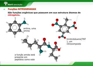 O documento descreve diferentes tipos de funções orgânicas nitrogenadas e outras, incluindo aminas, amidas, nitrocompostos, tióis, tioéteres, ácidos sulfônicos, nitrilas e compostos organometálicos. Fornece definições, estruturas, nomenclaturas e exemplos para cada uma dessas classes de compostos.