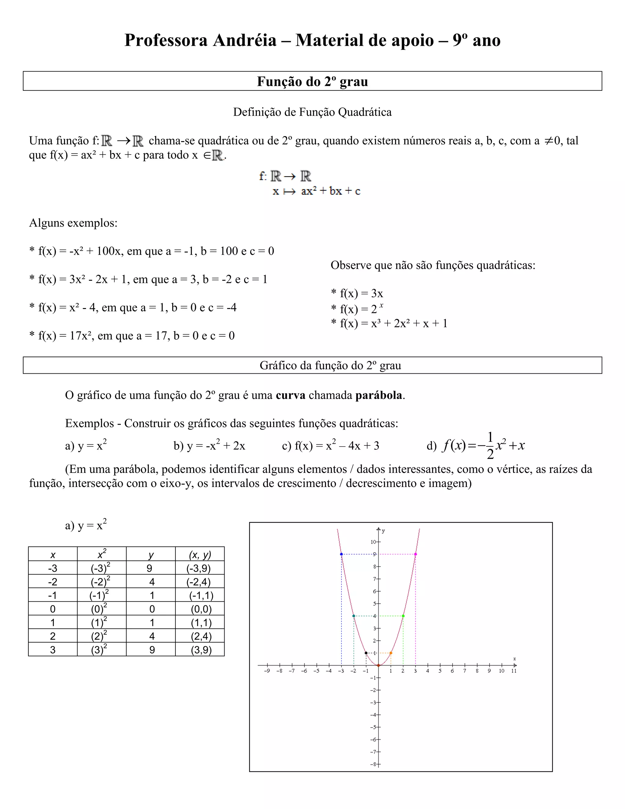 O documento define o que é uma função quadrática e fornece exemplos. Ele também mostra como construir e analisar gráficos de funções quadráticas, identificando elementos-chave como vértice, raízes, interseção com eixos e intervalos de crescimento/decrescimento.