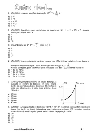 O documento apresenta uma lista de exercícios de funções exponenciais com 3 partes: 1) resolução de equações exponenciais, 2) resolução de sistemas de equações exponenciais e 3) resolução de inequações exponenciais. São propostos exercícios para serem resolvidos envolvendo operações com expoentes e logaritmos.
