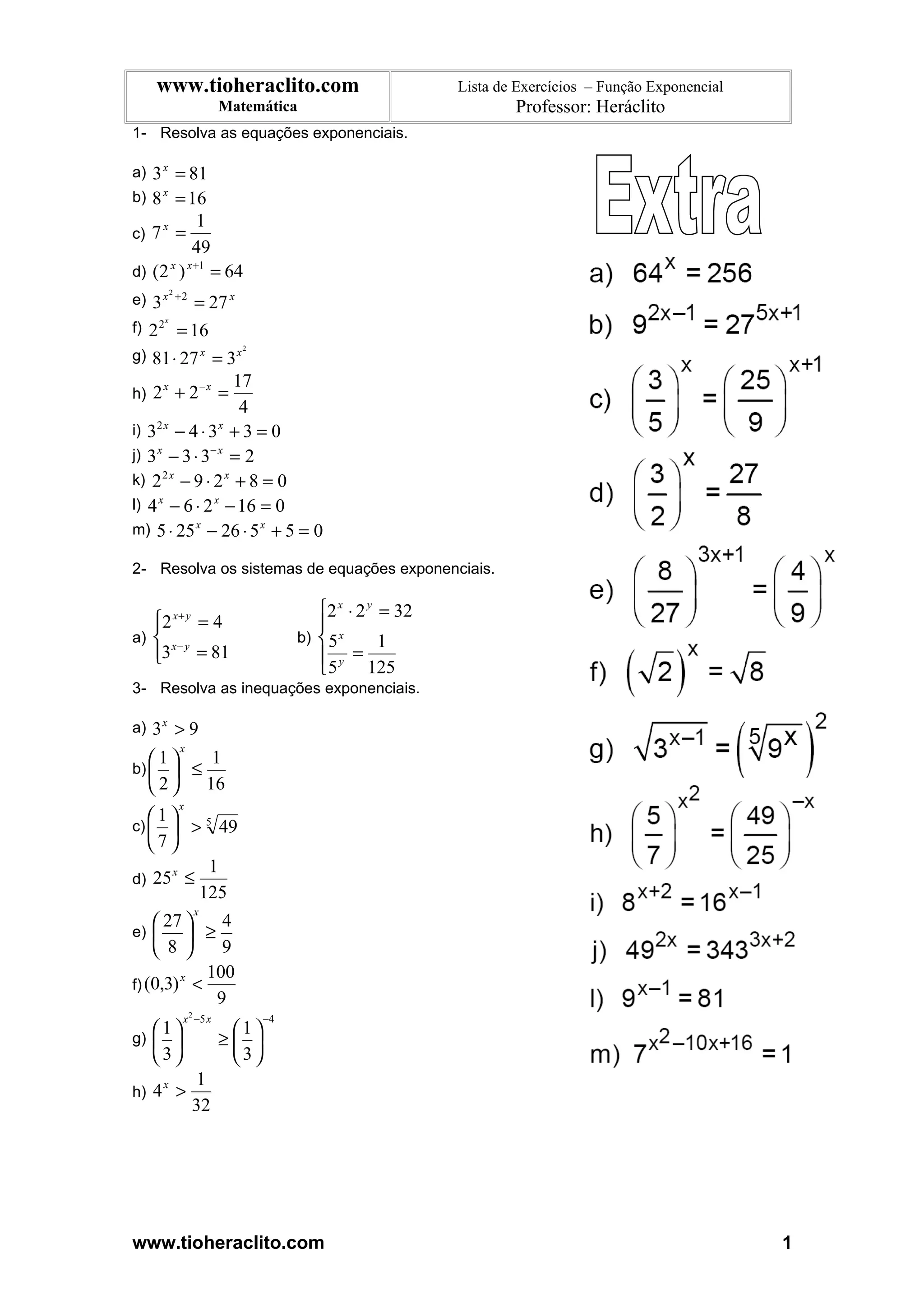 O documento apresenta uma lista de exercícios de funções exponenciais com 3 partes: 1) resolução de equações exponenciais, 2) resolução de sistemas de equações exponenciais e 3) resolução de inequações exponenciais. São propostos exercícios para serem resolvidos envolvendo operações com expoentes e logaritmos.