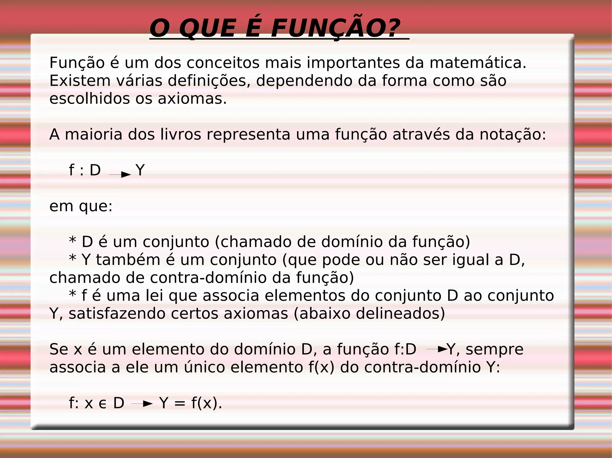 Uma função é um conceito matemático que associa elementos de um conjunto (domínio) a elementos de outro conjunto (contra-domínio), de tal forma que cada elemento do domínio é associado a exatamente um elemento do contra-domínio. O documento explica que uma função é definida pela notação f: D → Y, onde D é o domínio, Y o contra-domínio e f a regra de correspondência entre os elementos.