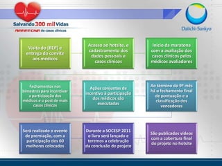 O documento descreve um projeto de concurso online de casos clínicos para médicos, com três grupos participantes: médicos avaliadores, coordenadores científicos e médicos maratonistas. Os médicos maratonistas publicam casos clínicos que são avaliados e geram pontuação em rankings. Ao final, os melhores casos são publicados em livro e os cinco médicos mais bem pontuados ganham participação em conferência.