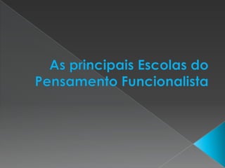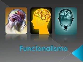 O documento descreve os principais aspectos do funcionalismo, a primeira corrente psicológica americana. O funcionalismo enfatizava os processos mentais e sua utilidade para a adaptação do organismo ao meio, estudando a mente por sua função e não por sua natureza. Privilegiava métodos como introspecção e comparação e influenciou o desenvolvimento da psicologia aplicada nos EUA.