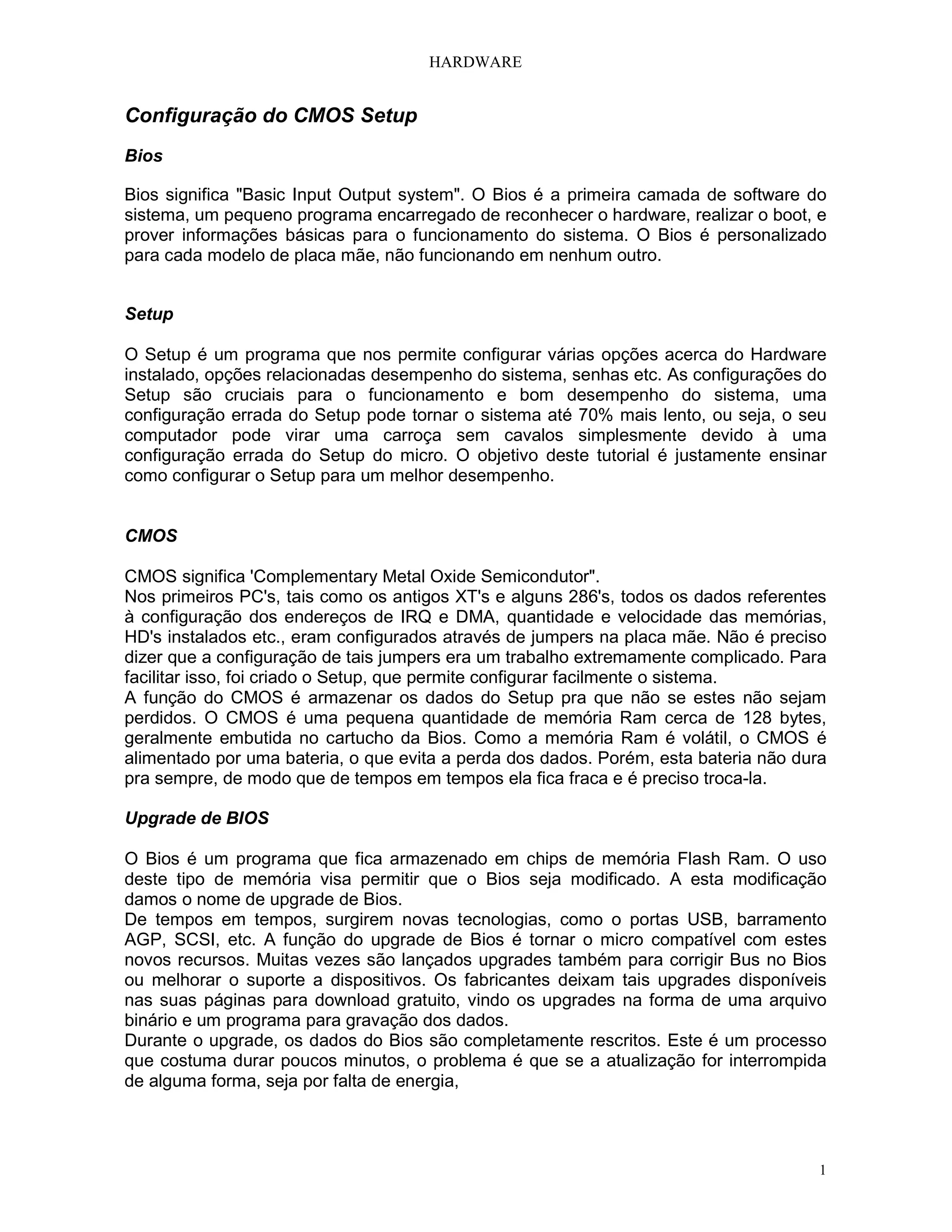 O documento discute as configurações do BIOS e CMOS de um computador. Explica que o BIOS inicializa o hardware, realiza o boot e fornece informações básicas de funcionamento. O CMOS armazena as configurações do BIOS para que não sejam perdidas quando desligado. O Setup permite configurar opções do hardware para melhor desempenho.