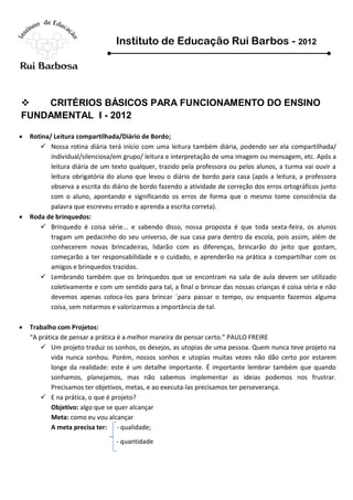 Este documento fornece diretrizes pedagógicas para o Ensino Fundamental I em 2012. Ele inclui recomendações sobre rotinas diárias, momentos de relaxamento, leituras, projetos interdisciplinares e atividades lúdicas para incentivar o desenvolvimento integral das crianças.