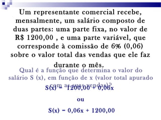 1) O documento descreve funções polinomiais do 1o grau que relacionam variáveis dependentes (salário S e saldo bancário S) com variáveis independentes (vendas x e notas retiradas x).