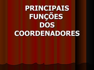 O documento fornece diretrizes para coordenadores de grupos sobre como desenvolver o grupo, preparar novos coordenadores, pontos de honra e lembranças importantes. As principais responsabilidades dos coordenadores incluem trabalhar em equipe, escolher temas, promover participação e estudos bíblicos. Eles também devem obedecer horários, manter sigilo e acolher membros retornando. A troca de coordenação ocorre semestralmente e os coordenadores devem servir humildemente.
