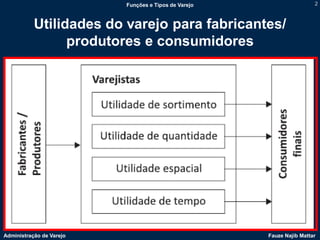 O documento descreve os principais tipos e formatos de varejo, incluindo lojas de departamento, especializadas, supermercados e hipermercados. Ele também discute funções, canais de distribuição, critérios de classificação e desafios da atividade varejista.