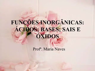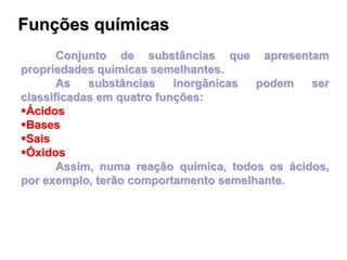 O documento discute as funções inorgânicas principais: ácidos, bases, sais e óxidos. Apresenta as definições de ácidos e bases segundo Arrhenius e descreve alguns exemplos importantes de cada função, incluindo suas propriedades e usos.