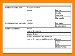 O documento discute a importância e classificação das fundações na construção civil, destacando seu papel na transferência de cargas e os custos envolvidos. Apresenta métodos de investigação do solo, tipos de fundações diretas e indiretas, e suas características. Conclui que a escolha da fundação deve considerar fatores técnicos e econômicos, buscando a segurança estrutural e a integridade das construções vizinhas.