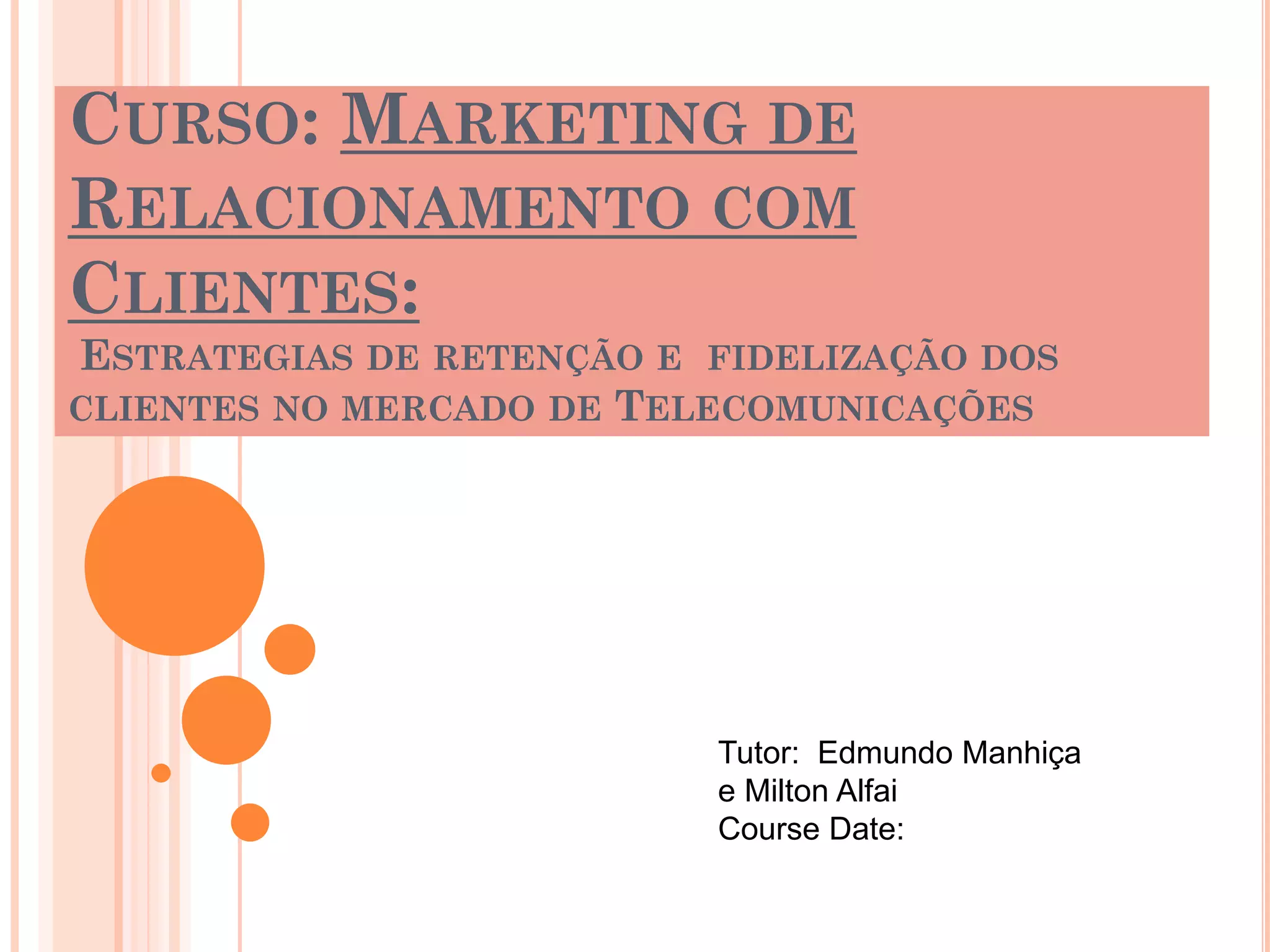 Este documento discute conceitos fundamentais de marketing de relacionamento com clientes, incluindo definições de marketing, comportamento do cliente, ferramentas do marketing mix, e estratégias para retenção e fidelização de clientes no mercado de telecomunicações.