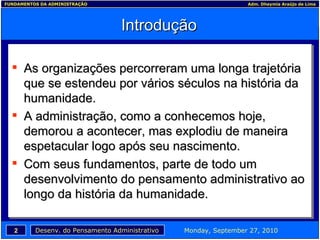 O documento discute os fundamentos da administração, traçando uma linha do tempo desde as primeiras civilizações até os dias atuais. Apresenta como a administração evoluiu de atividades incipientes em sociedades antigas para uma ciência aplicada vital para quase todas as organizações modernas. Também resume as principais influências no desenvolvimento do pensamento administrativo como filósofos, igreja, militarismo, revolução industrial e pioneiros empresariais.