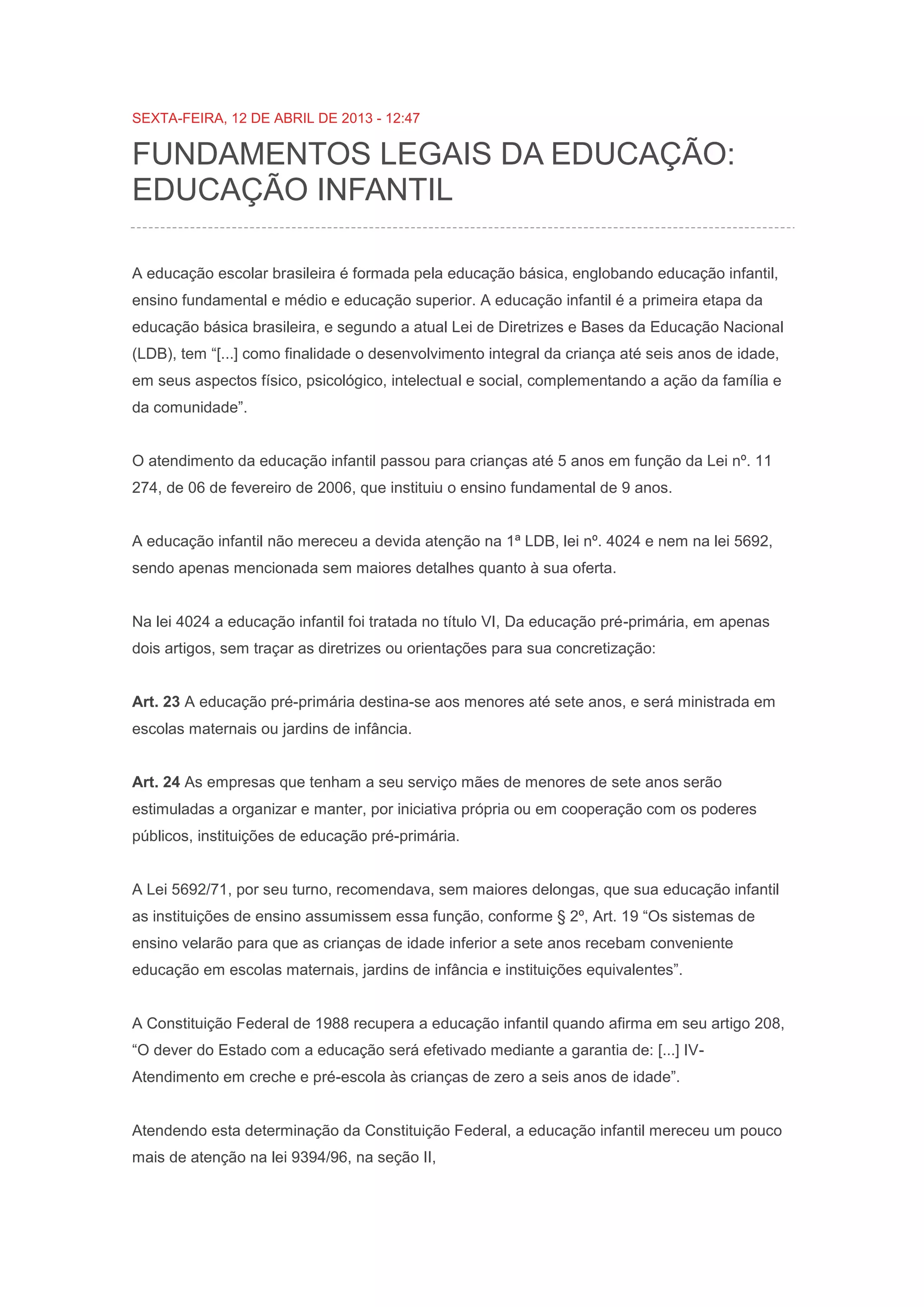 A educação infantil é a primeira etapa da educação básica brasileira. A lei atual define seu objetivo como o desenvolvimento integral da criança até 6 anos de idade. No entanto, a educação infantil recebeu pouca atenção nas leis iniciais e só foi melhor definida na Constituição de 1988. Apesar disso, ainda há uma grande demanda por vagas que não é atendida.