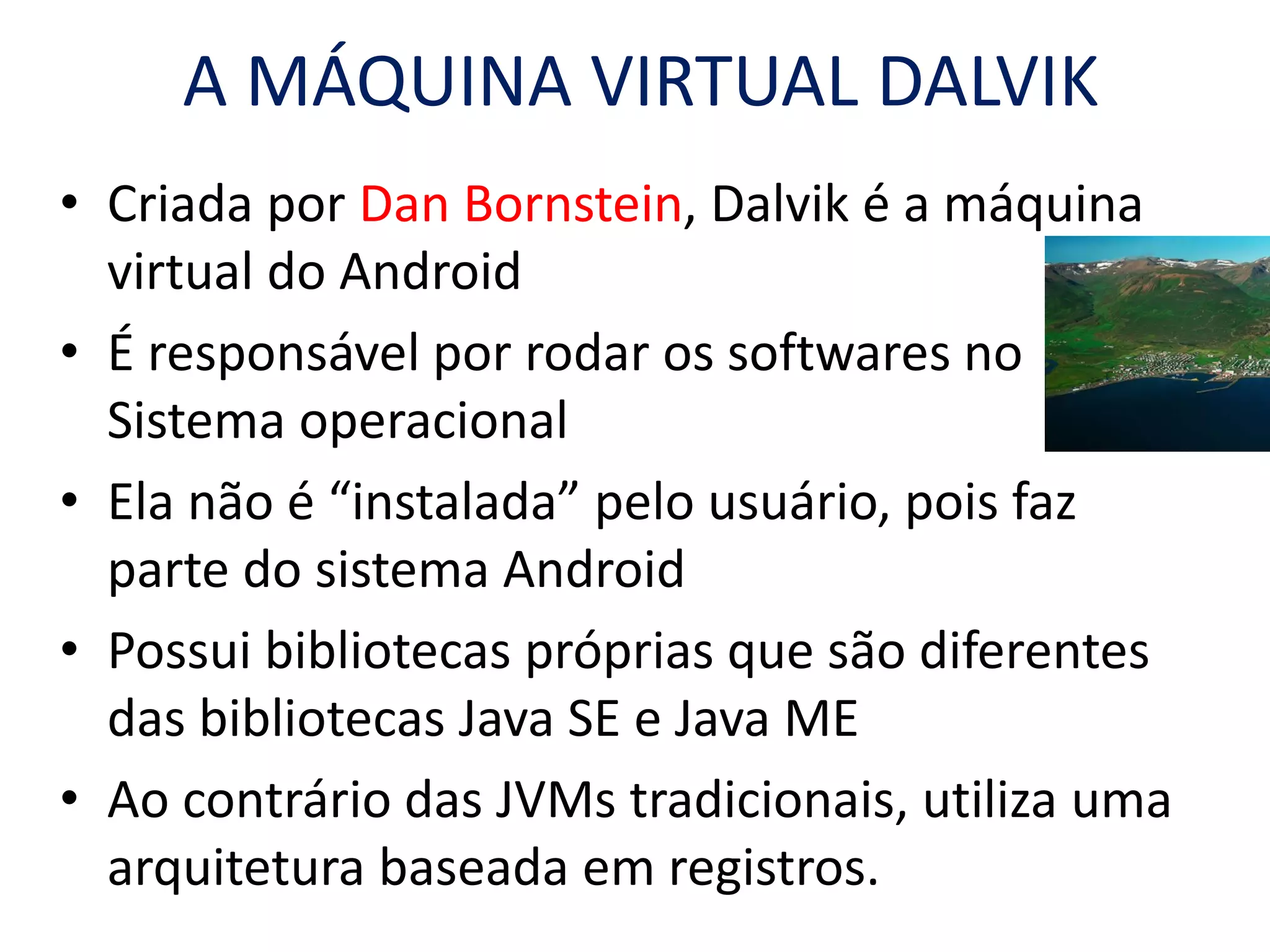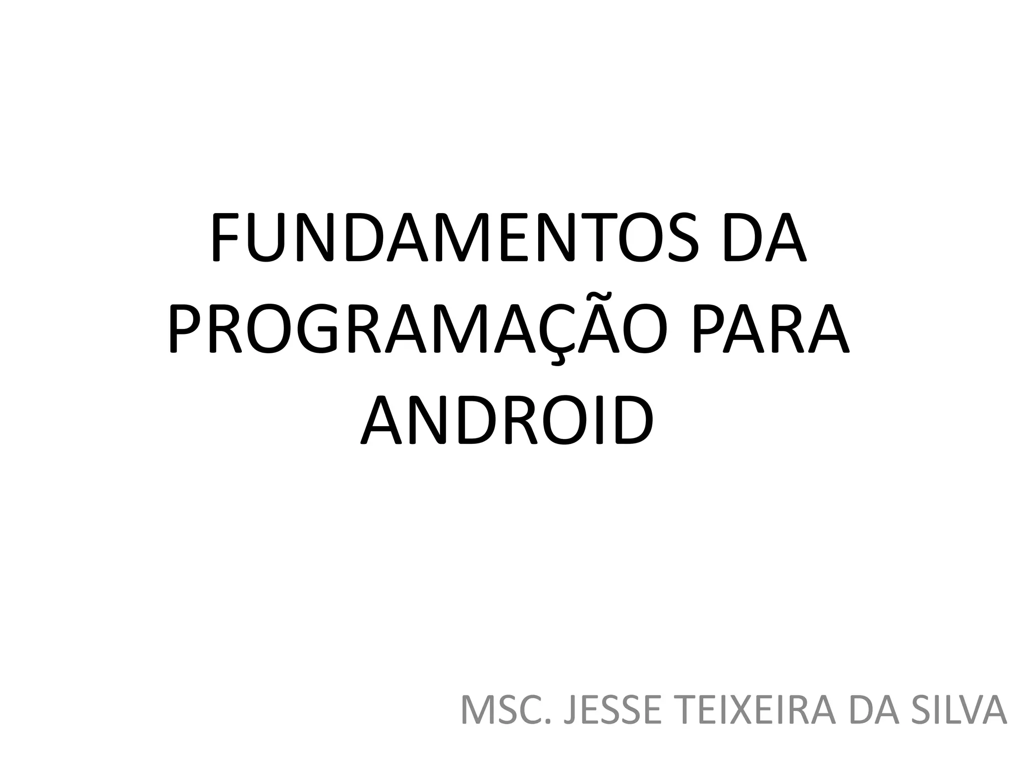 O documento descreve fundamentos da programação para Android, incluindo a máquina virtual Dalvik, ferramenta DX e estrutura de arquivos em aplicativos Android. A Dalvik é responsável por executar softwares no Android e possui bibliotecas próprias. A ferramenta DX converte arquivos Java em arquivos .dex executáveis na Dalvik. Aplicativos Android tem extensão .apk e contém arquivos .dex, recursos e manifesto.
