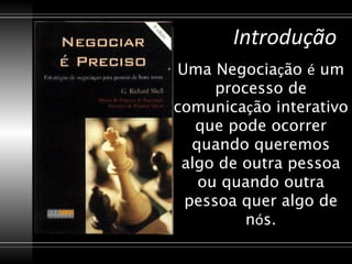 [1] Uma negociação é um processo de comunicação interativo que ocorre quando queremos algo de outra pessoa ou outra pessoa quer algo de nós. [2] Metas e expectativas elevadas são fundamentais para negociações efetivas, pois fornecem direção e convicção. [3] Comprometimento com metas ambiciosas transmite entusiasmo e controle durante as negociações.