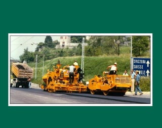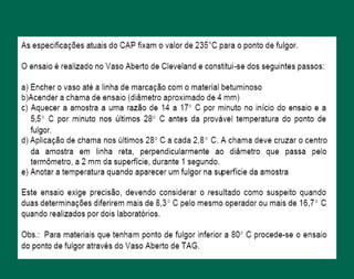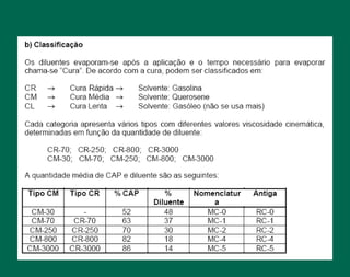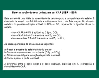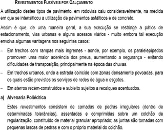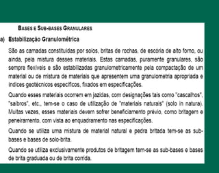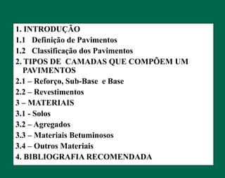 O documento descreve os principais componentes e materiais utilizados em pavimentos. Apresenta a definição, classificação e tipos de camadas que compõem pavimentos, incluindo reforço, sub-base, base e revestimentos. Também descreve os principais materiais como solos, agregados e materiais betuminosos, além de ensaios realizados para caracterização e dimensionamento de pavimentos.