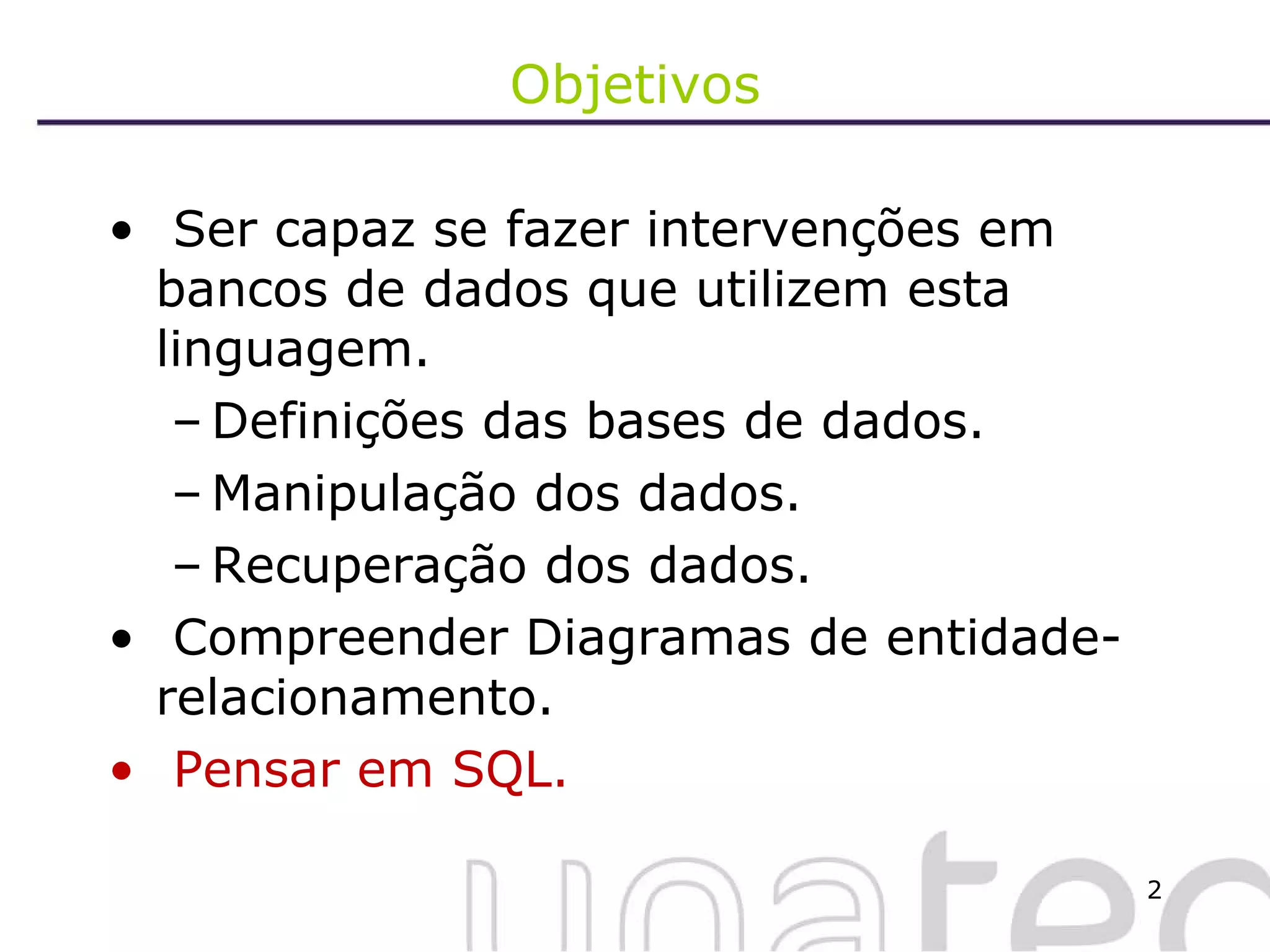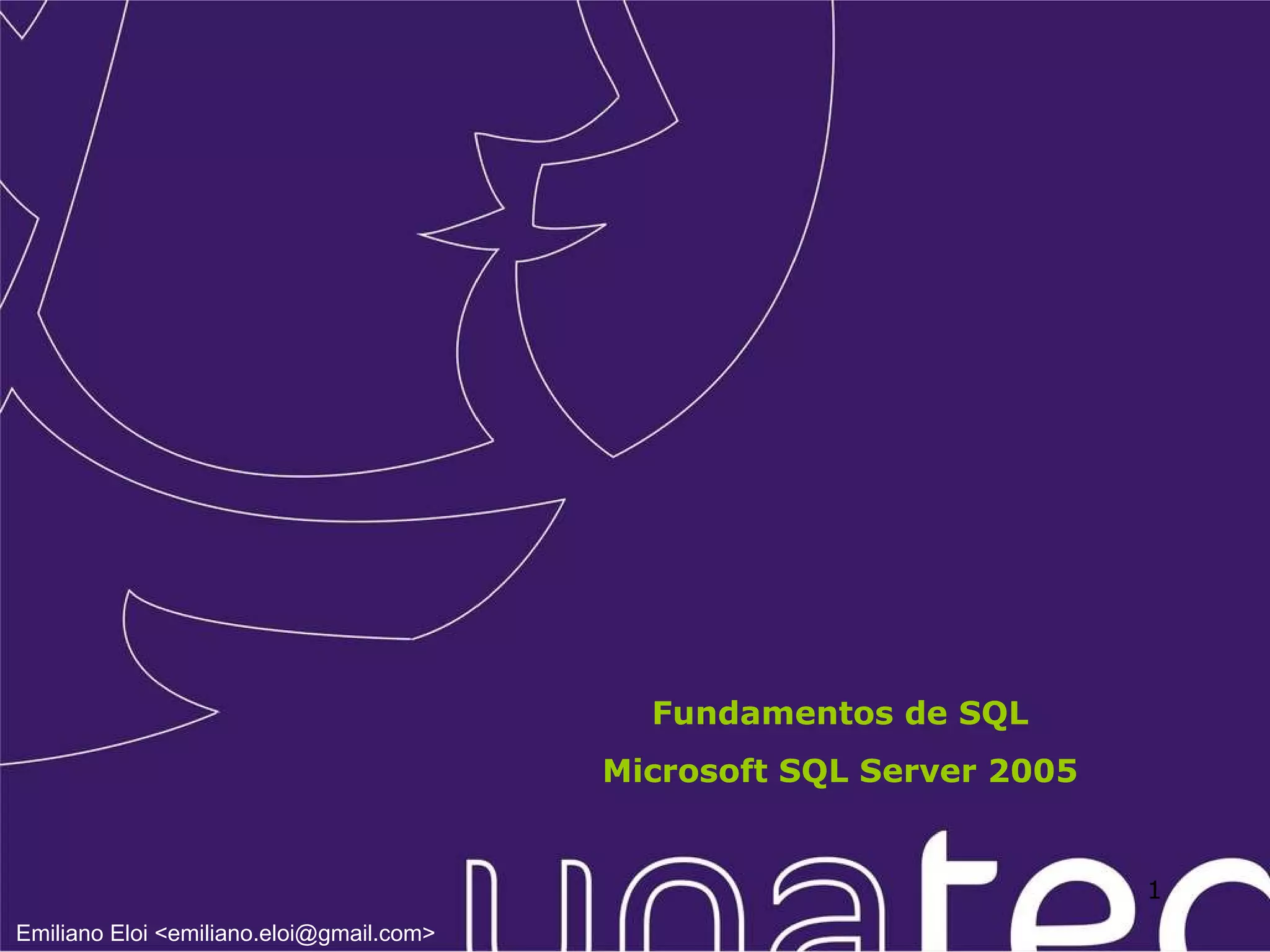 O documento apresenta fundamentos de SQL com foco no Microsoft SQL Server 2005, incluindo manipulação e recuperação de dados, modelagem de banco de dados com diagramas de entidade-relacionamento e operações básicas como inserção, atualização e exclusão de registros. São discutidos predicados e transações, além de práticas recomendadas para tratamento de erros em blocos de código SQL. Exemplos práticos de comandos e operações são fornecidos para ilustrar os conceitos abordados.