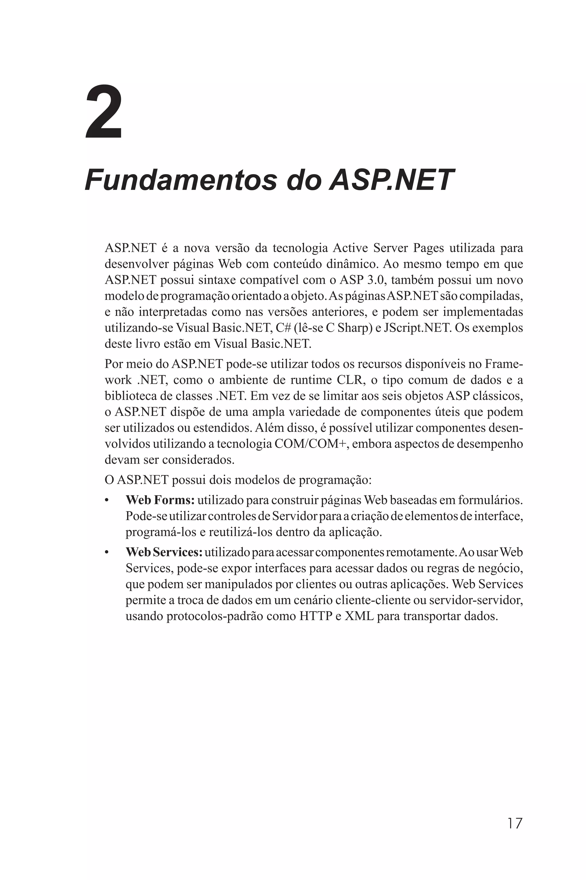 O documento resume os principais pontos do ASP.NET, incluindo que ele possui um novo modelo de programação orientado a objetos, as páginas ASP.NET são compiladas ao invés de interpretadas, e ele suporta dois modelos de programação: Web Forms e Web Services.