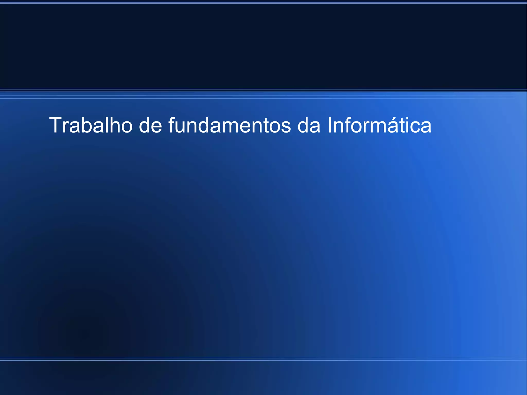 O documento discute os fundamentos da informática, definindo computador como uma máquina que processa dados e pode ser programada para realizar tarefas. Apresenta conceitos como sistema binário, lógica proposicional, história do computador desde a segunda guerra até gerações atuais e componentes como hardware, software e peopleware.