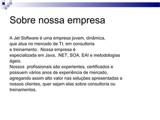Sobre nossa empresaA Jet Software é uma empresa jovem, dinâmica, que atua no mercado de TI, em consultoria e treinamento. Nossa empresa é especializada em Java, .NET, SOA, EAI e metodologias ágeis. Nossos profissionais são experientes, certificados e possuem vários anos de experiência de mercado, agregando assim alto valor nas soluções apresentadas a nossos clientes, quer sejam elas sobre consultoria ou treinamentos.