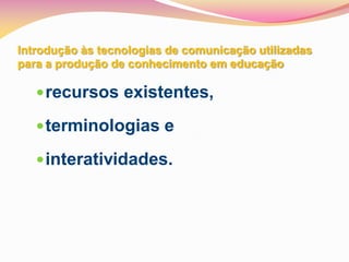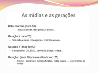 O documento discute o uso da plataforma Moodle na educação, incluindo seus recursos, terminologias e interatividades. Aborda como a mídia influencia a mente humana e a importância do pensamento crítico. Também diferencia tecnologia e mídia, e discute como escolher a melhor tecnologia educacional.