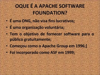 A Apache Software Foundation é uma organização sem fins lucrativos criada em 1999 para apoiar projetos de software livre e de código aberto, como o servidor HTTP Apache. A fundação hospeda mais de 50 projetos com a participação de mais de 1000 voluntários e tem como objetivo fornecer software gratuitamente para o público.