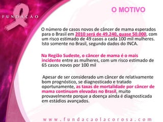 Em 2010, o Brasil fez uma estimativa de 49.240 novos casos de câncer de mama, com altas taxas de mortalidade devido a diagnósticos tardios. A fundação Laço Rosa foi criada para promover a prevenção e apoio no tratamento do câncer de mama, oferecendo serviços e um banco de perucas online. O lançamento oficial da fundação ocorrerá em 19 de outubro de 2010, com eventos para arrecadar fundos e conscientizar a população sobre a doença.