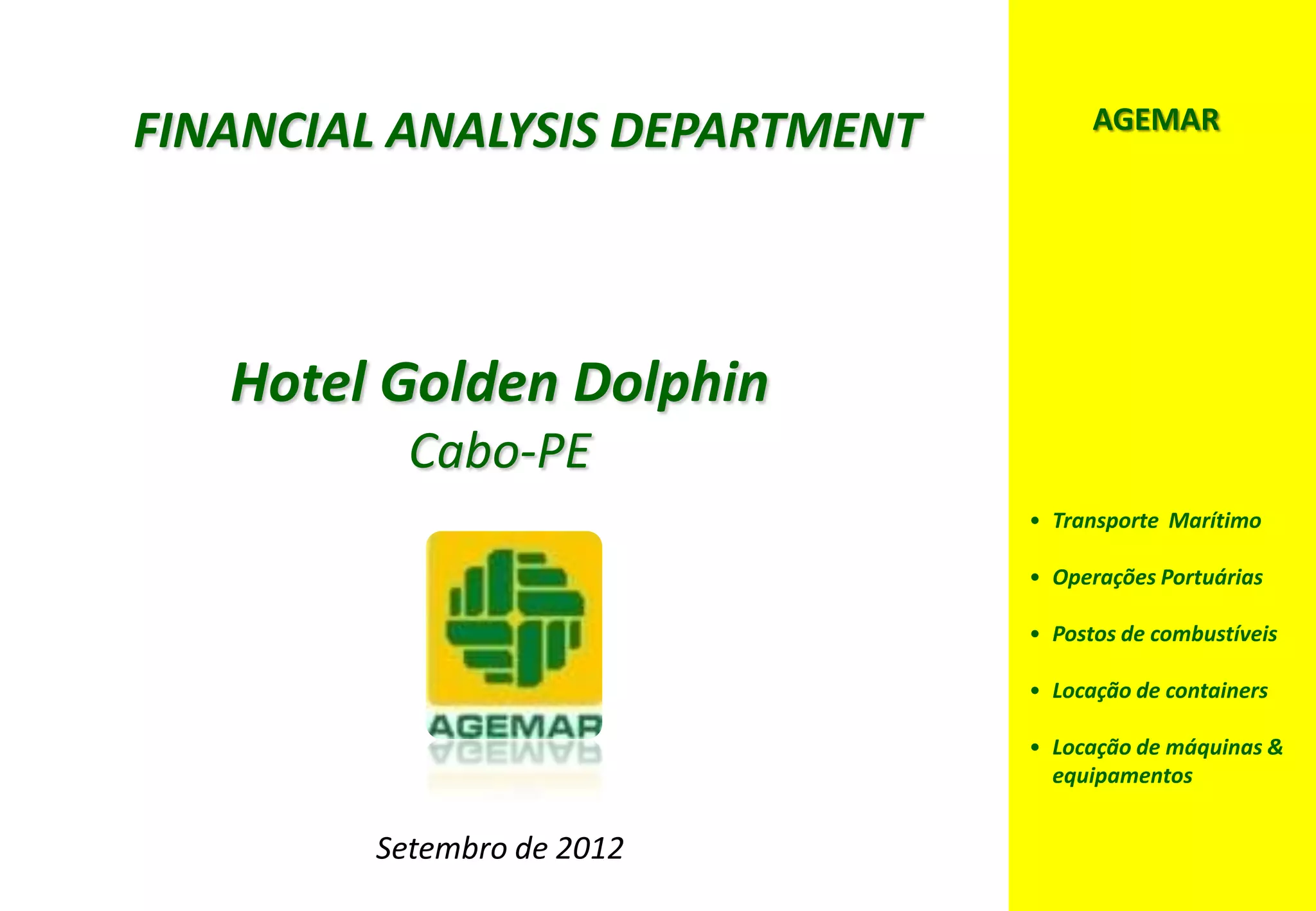 O relatório analisa a viabilidade econômico-financeira do Hotel Golden Dolphin da Agemar em Cabo de Santo Agostinho, visando financiamento pelo BNDES. Apresenta uma visão abrangente sobre o cenário macroeconômico, a situação da empresa, o mercado e as premissas para projeções financeiras. Indicadores de viabilidade foram calculados com base no fluxo de caixa, destacando a capacidade do projeto em atender as expectativas de retorno dos acionistas.