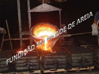 O documento descreve o processo de fundição em moldes de areia, detalhando suas principais etapas: confecção do modelo, fabricação do molde, fusão do metal, vazamento no molde, desmoldagem e acabamento da peça fundida. Explica também os diferentes tipos de moldes de areia usados e suas características, como a areia verde, seca e cimento, além de apresentar um estudo de caso sobre o gerenciamento de areias de fundição no Paraná.
