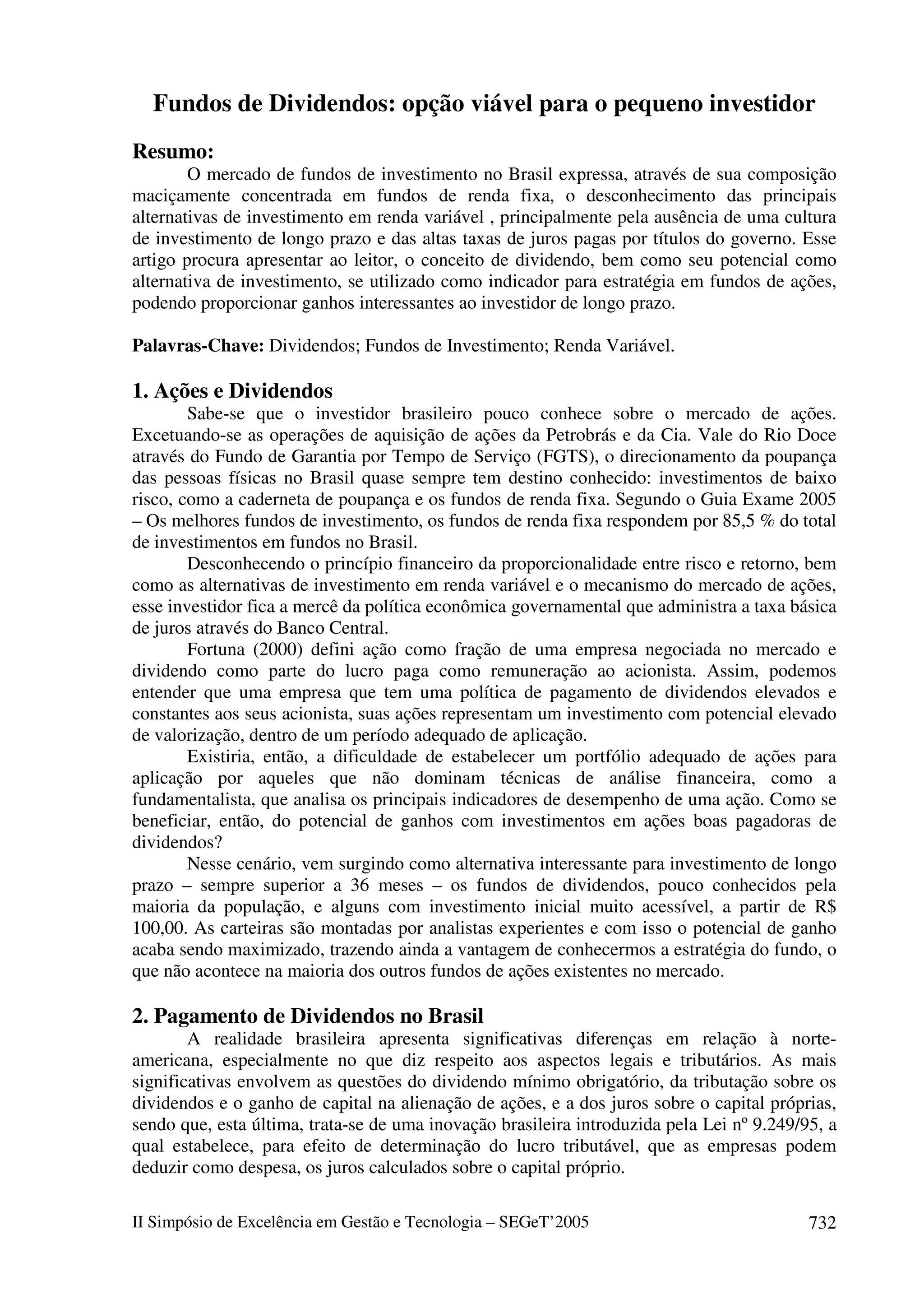 O documento discute fundos de dividendos como uma opção viável para pequenos investidores no Brasil. Explica que esses fundos podem proporcionar ganhos interessantes ao investidor de longo prazo, pois compram ações de empresas com boa política de pagamento de dividendos, maximizando o potencial de ganho. Também aborda como a legislação brasileira influencia a distribuição de dividendos e a tributação sobre eles.
