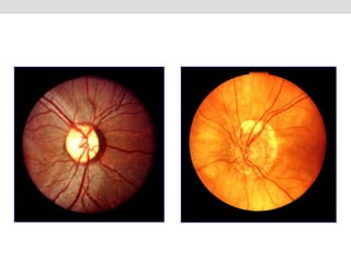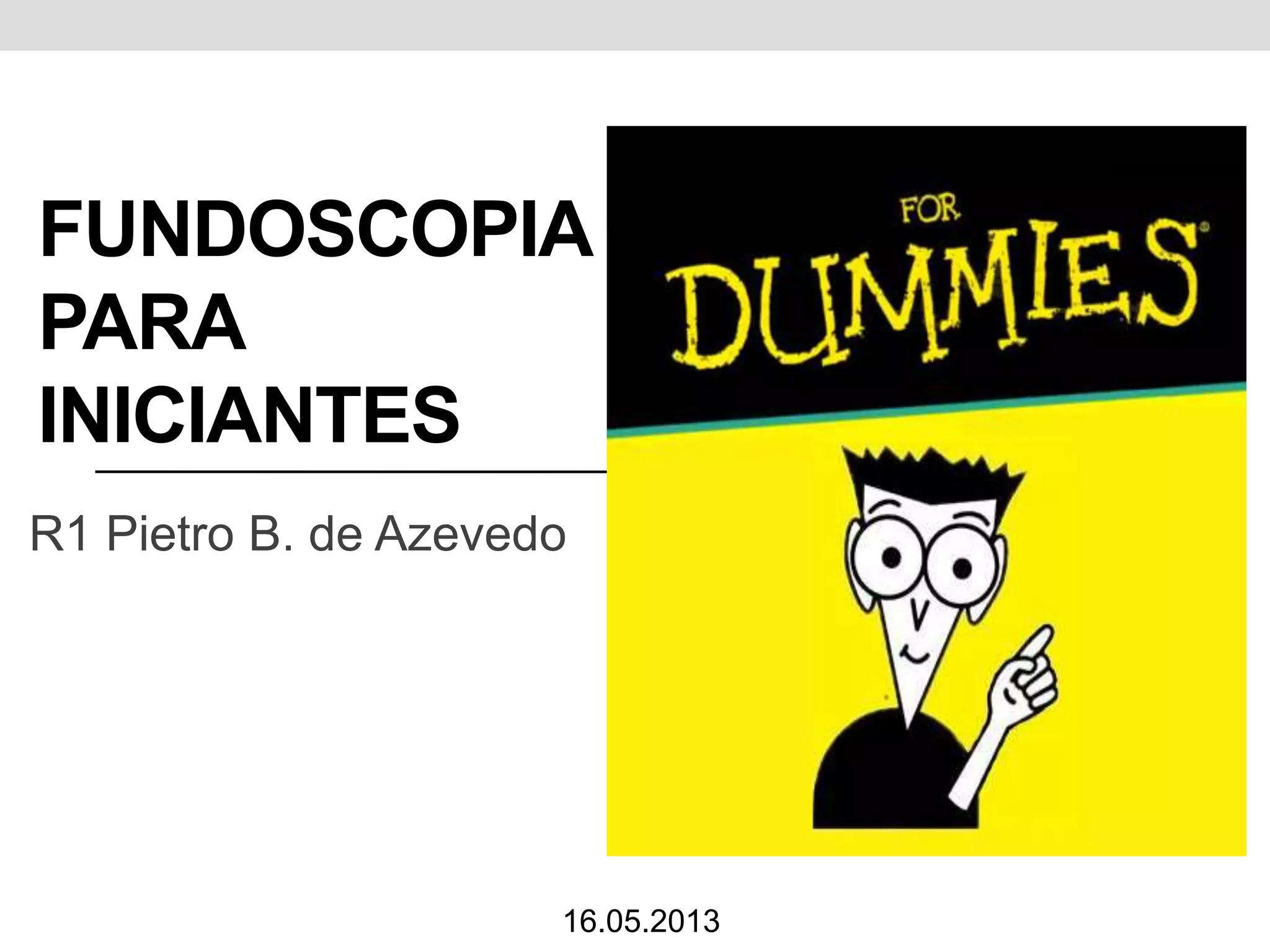 O documento fornece um guia introdutório sobre fundoscopia, descrevendo o uso do oftalmoscópio direto em um ambiente escuro e as posições corretas do paciente e do examinador. Ele detalha os passos do exame, incluindo a observação da papila, região macular e vasos, além de descrever aspectos a serem notados como catarata e hemorragia. Orientações sobre a postura do paciente e a técnica adequada para evitar reflexos luminosos são abordadas.