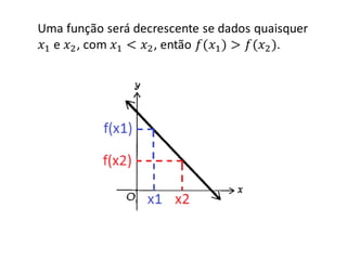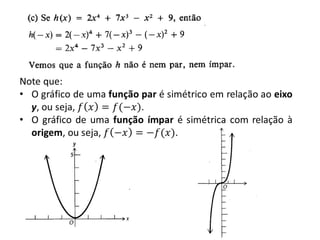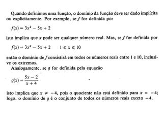 O documento aborda conceitos fundamentais sobre funções, incluindo definição, domínio, imagem, e tipos como funções compostas, par, ímpar, crescentes, decrescentes, e periódicas. Inclui exercícios práticos para identificação e elaboração de funções, além de discussões sobre gráficos e operações elementares. Também menciona a inversa de uma função e apresenta uma lista de exercícios para aprofundamento no tema.