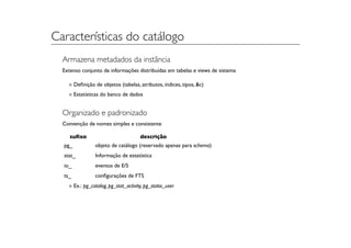 O documento descreve funções administrativas do PostgreSQL para obter informações sobre o banco de dados, como metadados do catálogo, estatísticas de atividade e logs de transações. É explicado como essas funções podem ser usadas para monitorar e diagnosticar o servidor.