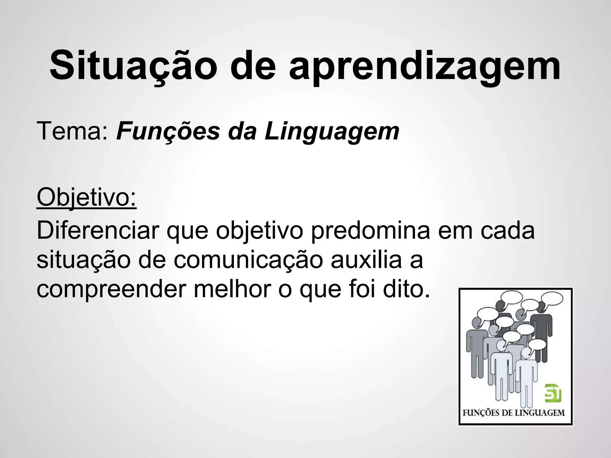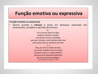 Este documento discute as funções da linguagem, definindo e dando exemplos de função emotiva, referencial, apelativa, fática, poética e metalingüística. Apresenta atividades como pesquisa na internet, perguntas, explicação pelo professor e ilustração das funções para diferenciar seus objetivos na comunicação.
