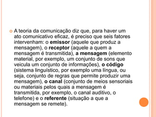 O documento discute as funções da linguagem na comunicação e no jornalismo. Apresenta seis funções linguísticas essenciais para a comunicação: expressiva, conativa, referencial, fática, metalinguística e poética. Explora cada função e exemplifica como elas são utilizadas na linguagem jornalística para transmitir informações de maneira eficaz.