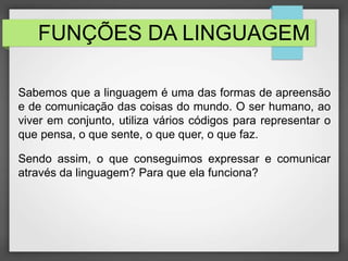 1) O documento discute as seis funções da linguagem, sendo elas: referencial, expressiva, apelativa, poética, fática e metalinguística. 2) Cada função serve um propósito específico na comunicação, como transmitir informações sobre fatos, expressar emoções ou influenciar o receptor. 3) Exemplos ilustram cada uma das funções.