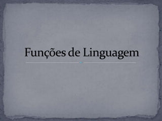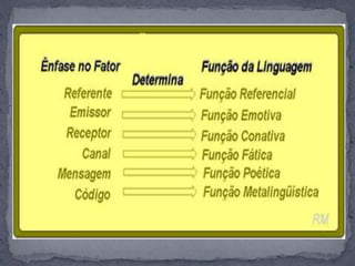 O documento descreve as seis funções da linguagem de acordo com Roman Jakobson: emotiva, conativa, referencial, fática, metalinguística e poética. Ele também fornece exemplos e características de cada função.