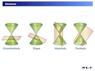 O documento discute as propriedades geométricas e algébricas de hipérboles e parábolas. Apresenta hipérboles como seções de um cone e suas propriedades focais, e parábolas como seções paralelas a uma geratriz de um cone e como lugares geométricos definidos por distância focal. Também explora parábolas como gráficos de funções quadráticas e métodos gráficos para resolver equações de segundo grau.